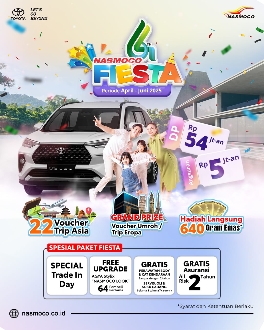 Rasakan pengalaman berkendara yang nyaman dan berkelas bersama Toyota Veloz, kini hadir dengan penawaran spesial hanya di NASMOCO FIESTA 2025!